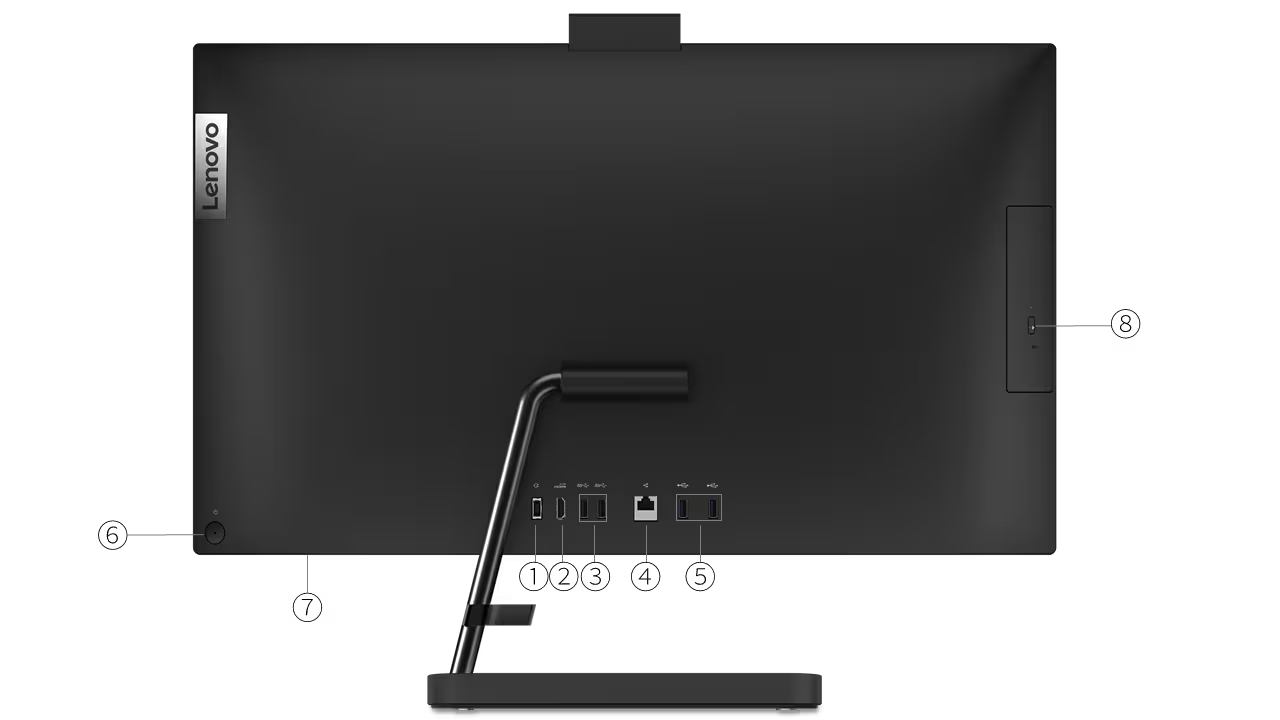 1. Power connector 2. HDMI 1.4 3. 2x USB 3.2 Gen 1 4. Ethernet (RJ-45) | 5. 2x USB 2.0 6. Power button 7. Headphone / microphone combo jack (3.5mm) 8. Optical drive eject button |