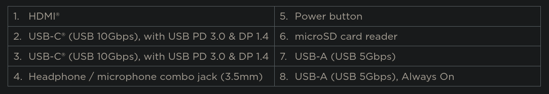 2x USB-C® (USB 10Gbps / USB 3.2 Gen 2), with USB PD 3.0 and DisplayPort™ 1.4