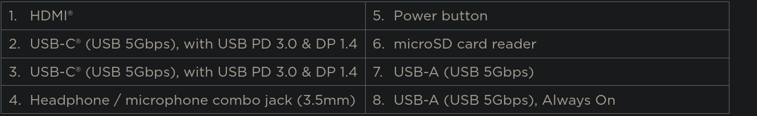 - 2x USB-C (USB 5Gbps / USB 3.2 Gen 1), with USB PD 3.0 and DisplayPort 1.4