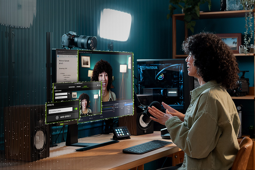 NVIDIA Broadcast Вашето домашно студио, задвижвано от изкуствен интелект Пренесете вашите стрийминг предавания, гласови чатове и видеоразговори на ново ниво с AI-подобрени глас и видео. Премахнете разсейващия фонов шум, персонализирайте фона си и още много други с едно натискане на бутон. | RTX Video Подобрете гледането на видеоклипове RTX Video Super Resolution и HDR използват изкуствен интелект, за да преобразуват вашите видеоклипове в Chrome, Edge или Firefox – автоматично изчистват детайлите и премахват артефактите от компресирането. Насладете се на невероятна яснота с резолюция до 4K. | RTX Remix Ремастерирайте класиките RTX Remix позволява на модификаторите лесно да записват игрови ресурси, да подобряват материалите с AI инструменти и да създават впечатляващи RTX ремастери с ray tracing и DLSS. | Video Editing Скоростта среща креативността Използвайте мощността на девето поколение NVIDIA Encoder (NVENC) за изключително бърз износ на видео и AI-управлявани ефекти в DaVinci Resolve, Adobe Premiere Pro и други. |