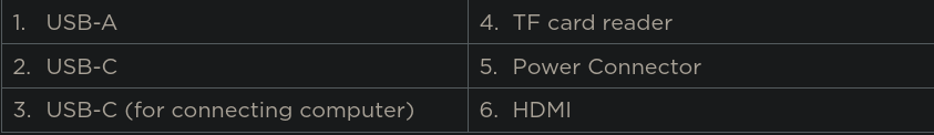 | USB Ports | 1 x USB-A 10 Gbps 1 x USB-C 10 Gbps 1 x USB-C PD 3.0 Upstream to NB(Max.60W) |