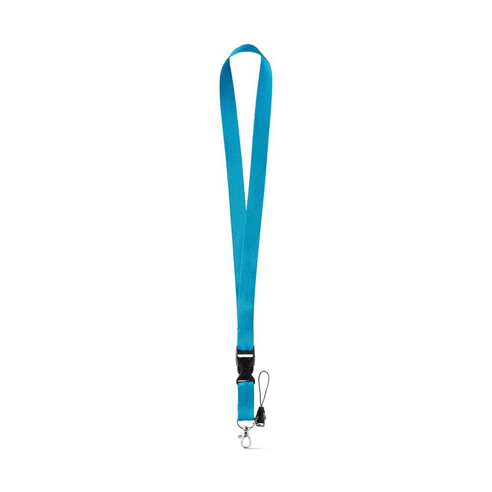• Полиестерна връзка за бадж с метален карабинер, подвижна катарама и каишка за мобилен телефон.