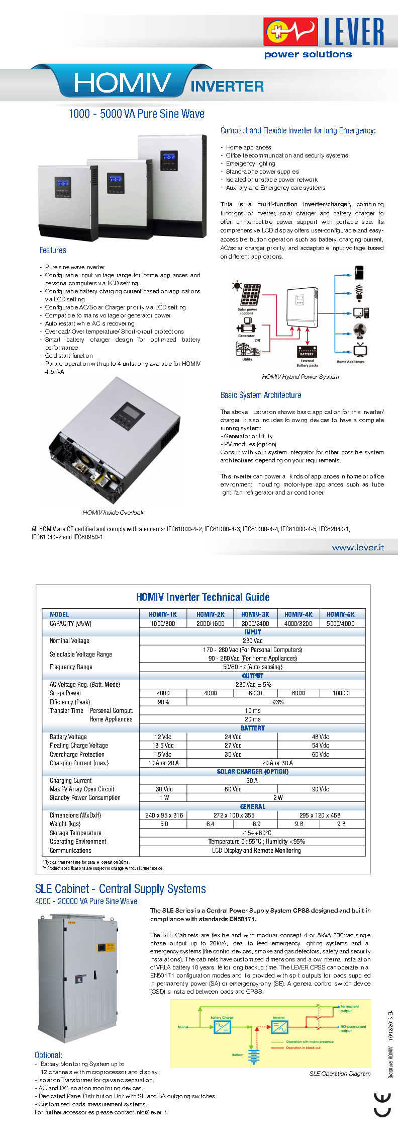 Хибриден Синусоидален Инвертор на фирма LEVER - Италия за системи в островна конфигурация с вход от мрежа, генератор и слънчеви панели. Зарежда батерията и товарите до 5KVA