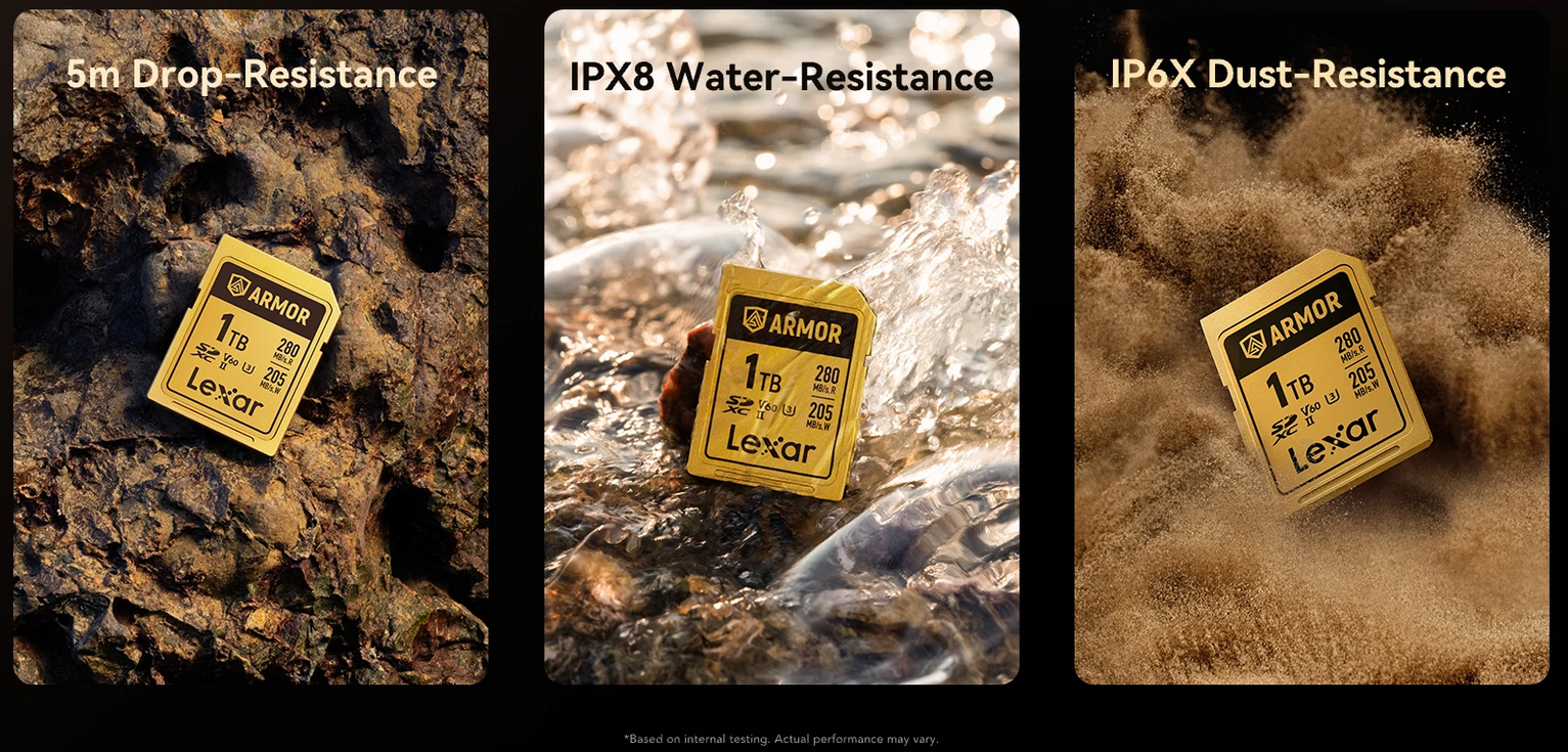 Equipped with an IP68 rating, the Lexar Armor Gold SDXC UHS-II Card safeguards your card against dust, debris, and water damage. It's also certified to withstand drops of up to five meters.