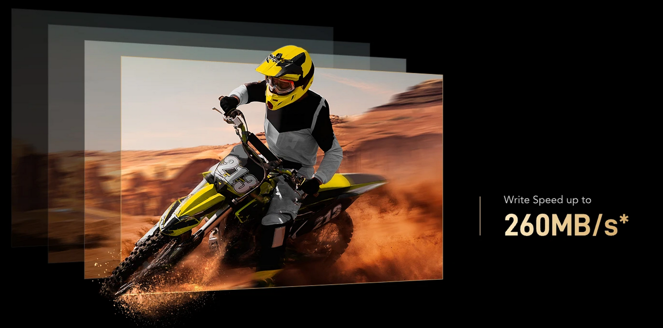 With write speeds of up to 260MB/s, handle sequential burst mode and RAW plus JPEG effortlessly, so you never miss a shot.