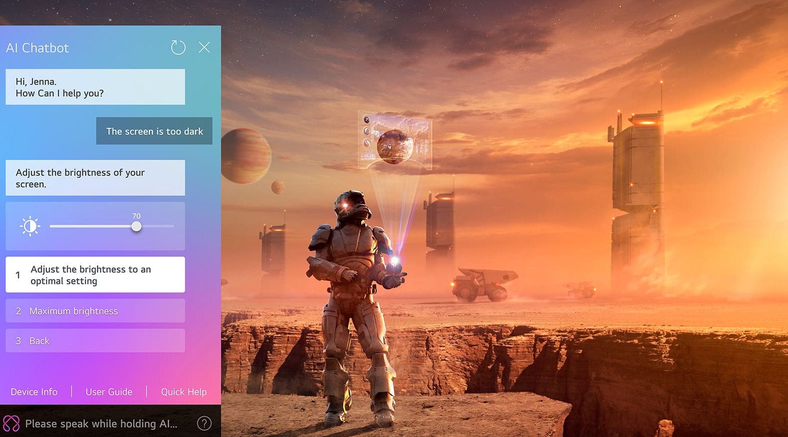 Разполагате със собствен AI Chatbot, който активно отговаря на вашите въпроси и ви помага. Само говорете на телевизора си, тъй като той може да класифицира желанията ви и да реагира по подходящ начин.