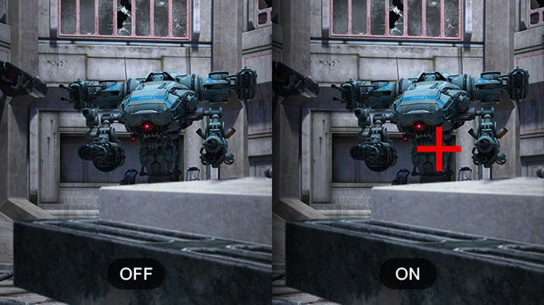 |  | Crosshair Прицелната точка се фиксира в центъра, за да подобри точността при стрелба. |