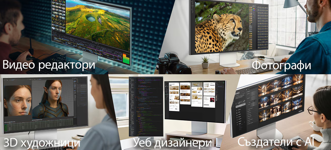 Високопроизводителен дисплей, пригоден за взискателни професионални работни процеси, осигуряващ прецизна цветова точност, обширно визуално пространство и безпроблемна съвместимост, в помощ на видео редактори, фотографи, 3D артисти, създатели на изображения с изкуствен интелект и уеб дизайнери, като същевременно увеличава максимално производителността във всяка задача.
