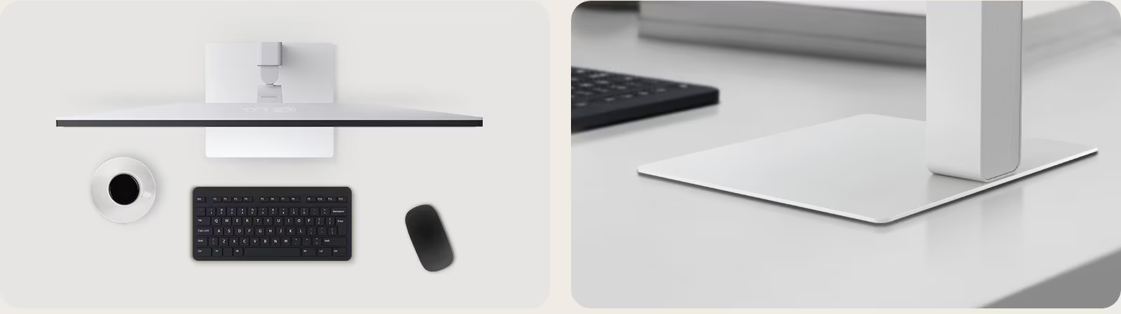 A sleek L-shaped stand is designed for ergonomic comfort with tilt adjustment, and is also compatible with 100×100 VESA wall mounting for flexible installation and efficient use of workspace.