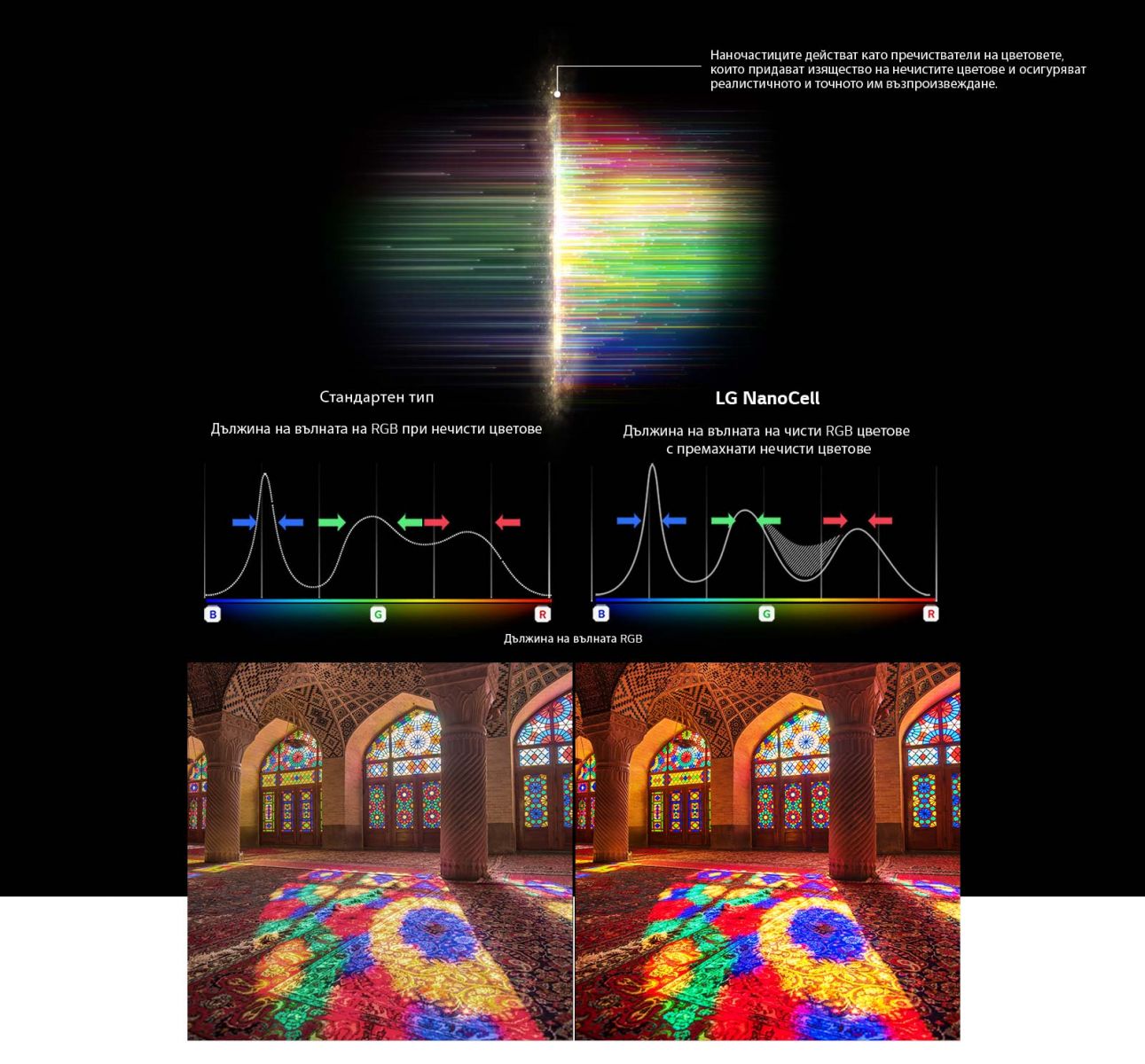 Чистите RGB цветове са ключът към реалистичното качество на картината. Технологията NanoCell прилага наночастици, които осигуряват изчистване на цветовете, като филтрират матовите цветове и увеличават чистотата на RGB цветовия спектър.