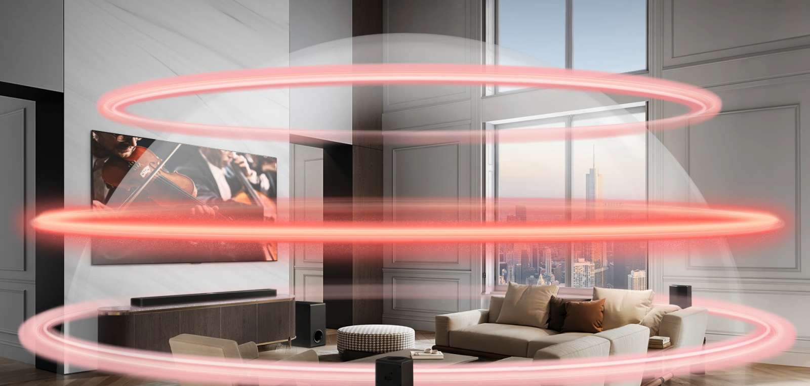 Тристепенен пространствен звук добавя виртуален слой, за да създаде около вас звуков купол с по-наситен звук.
