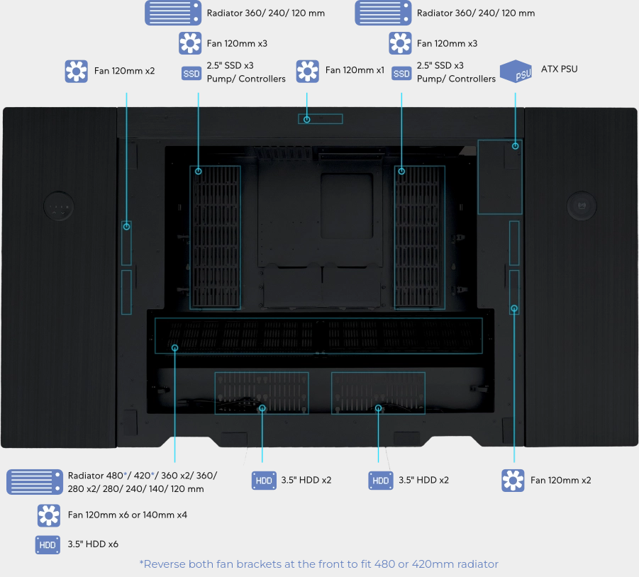 Front: 360 x 2 / 280 x 2 / 360 / 280 /240 /140 / 120mm radiator
