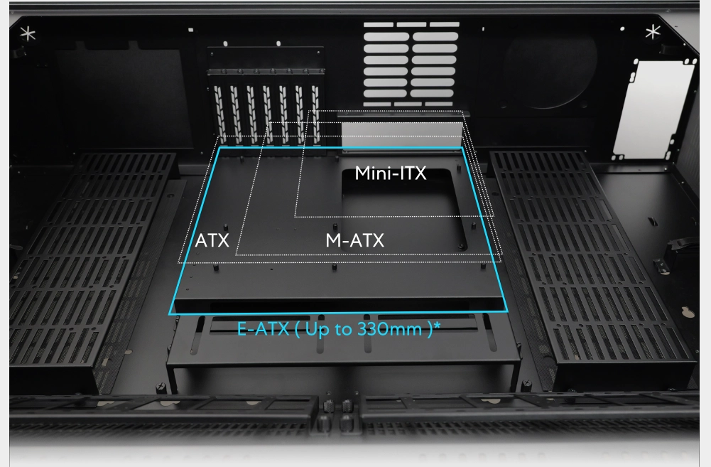 Features two modular motherboard trays with adjustable cable-concealing shield brackets. The shield bracket can slightly move its position to accommodate different components, ensuring a clean and organized setup.