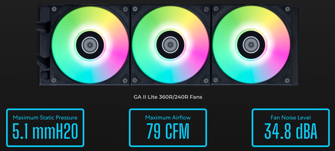 High-performance pump The compact GA II Lite pump reaches speeds of up to 3800 RPM, providing powerful cooling for efficient CPU temperature management. | ![]() |