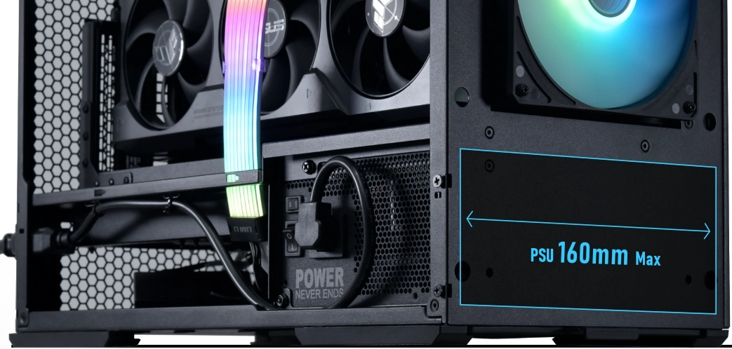 The PSU is strategically placed at the front, with connector ports facing outward for convenient cable connection. Additionally, a PSU power adaptor extension cable is provided for rear power access.
