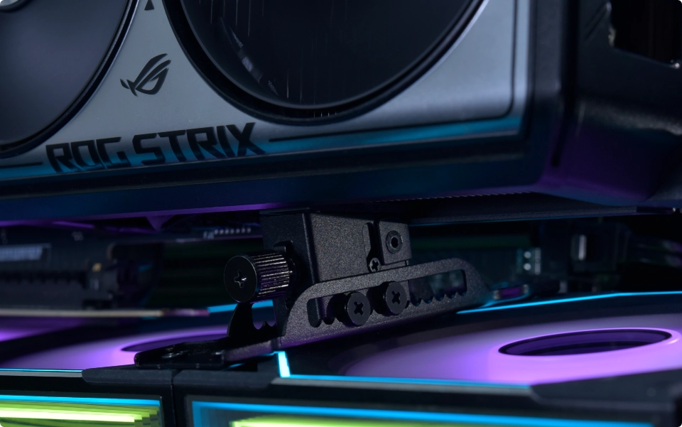 The vertical GPU support bracket features height adjustment to accommodate thick cards and prevent GPU sag.