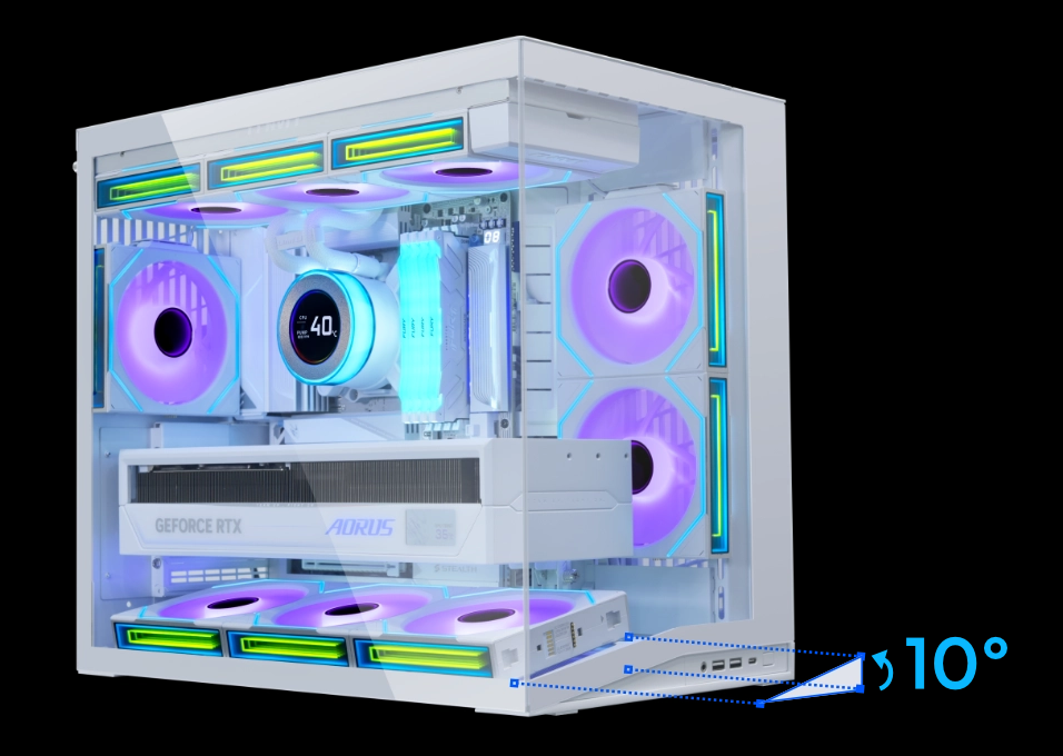 A 10° slanted bottom channels cool air directly to the GPU for better cooling performance and a cleaner look.