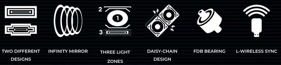 Zone 1: Fan Blade & Center Hub Features an infinity mirror effect for stunning visual depth and dynamic lighting. | Zone 2: Diffused Side Strip Includes infinity mirrors on both sides.each with a unique style for diverse aesthetic options. | Zone 3: Inner Edge Highlights the inner edge of the infinity mirror, adding a refined and immersive glow. |