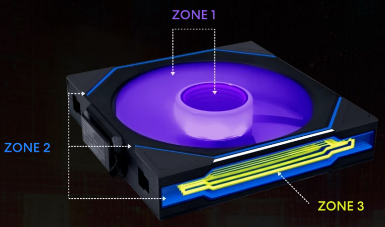 Individually controlled lighting across the blade hub, dual side strips, and inner edge.