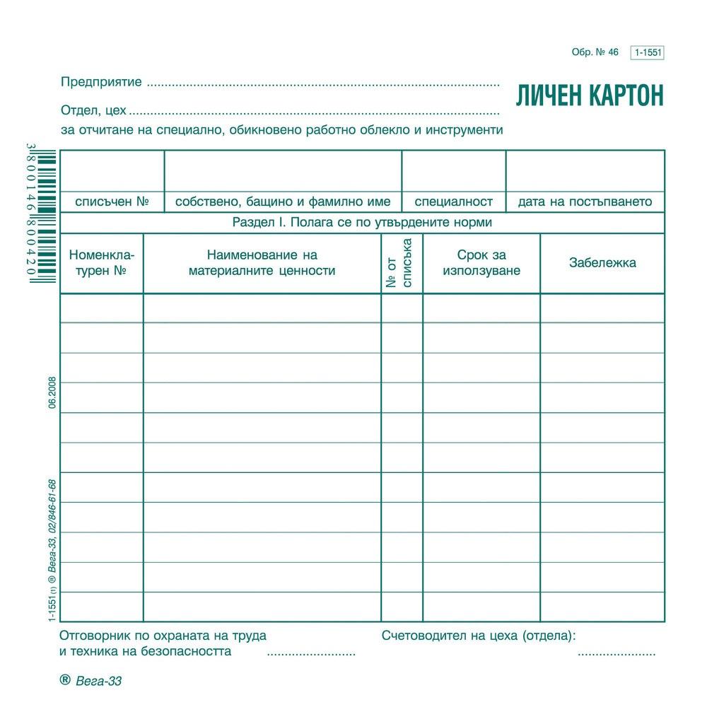 Открийте перфектното решение за организация на личния състав с Личен картон за облекло образец 46 от Вега! • Висококачествен офсет картон за дълготрайна употреба• Удобен формат 2/3 B4 за лесно съхранение и обработка• Идеален за нуждите на ТРЗ, деловодство и личен съставИзберете надеждност и ред във Вашата документация още днес!