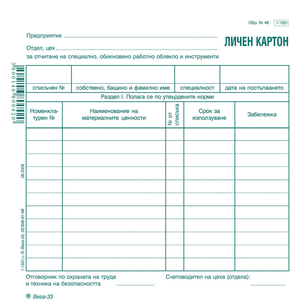 Личен картон за отчитане на специално работно облекло и стопански инвентар, картон, 214x 218 мм