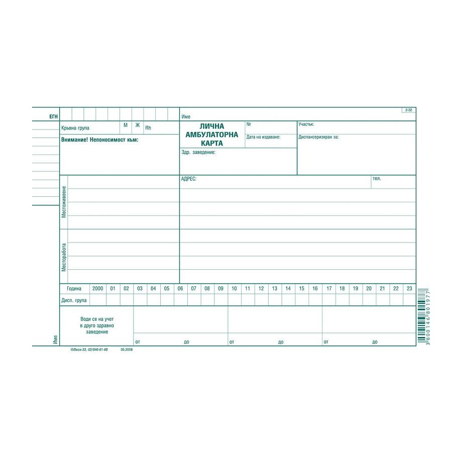 Лична амбулаторна карта 2-32., вестникарска хартия, A5, 24 л.
