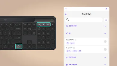 Customizable shortcuts Streamline workflows with built-in shortcuts that are customizable through Logi Tune, including the F-row keys, AI Launch Key, meeting controls, and more (5Out of the box, the AI Launch Key opens Copilot in Windows or Gemini on ChromeOS. Copilot requires Windows 11 or later and Gemini requires Chrome version 133.0.6882.0 or above. Meeting control keys require Logi Tune for or Logi Options+ for full functionality. Available for Windows and macOS at logi.com/tune or logi.com/optionsplus.). | Switch between devices Easy-Switch lets you connect the keyboard to up to 3 devices like a laptop, desktop computer, or tablet, and seamlessly switch between them. | Reliable, secure wireless Connect with Bluetooth or the Logi Bolt USB-C receiver, which offers a secure and reliable wireless connection that’s fully encrypted. |