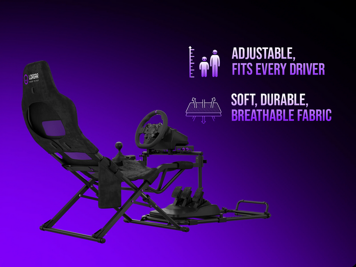 Racing-Style Seat The integrated textile seat positions the driver in an authentic racing stance with support at key contact points. The seat design accommodates drivers between 160 cm and 190 cm in height, with adjustable positioning to dial in the optimal distance to wheel and pedals. Breathable fabric keeps drivers comfortable through multi-hour endurance sessions. | ![]() |
