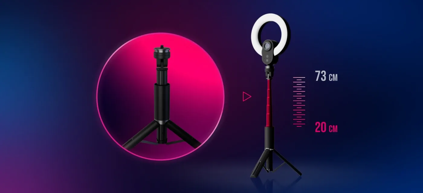 ![]() | Статив В комплекта има универсален сгъваем статив, който се разтяга от 20 до 73 см. Стандартната резба го прави съвместим и с други аксесоари. |