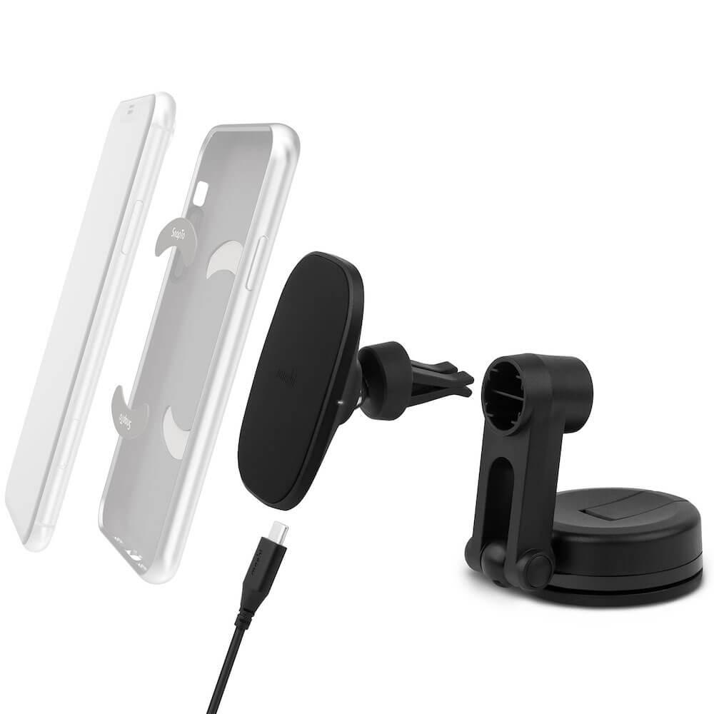 Монтирайте вашият телефон с Moshi SnapTo™ кейс, друг магнитен кейс или просто използвайте магнитните пластини в комплекта навсякъде в автомобила си, с помощта на вентилационния клип или адаптера за табло/стъкло