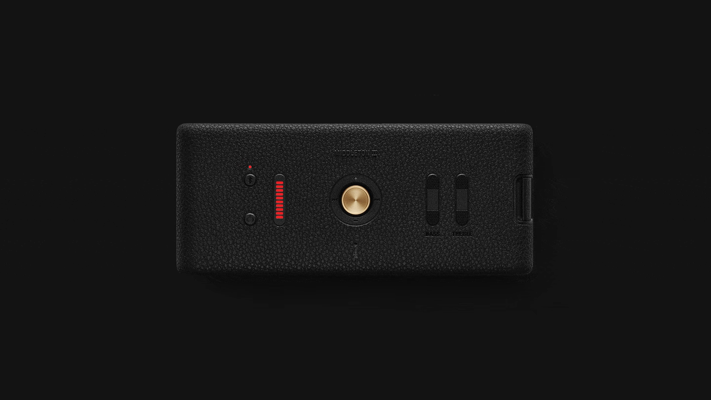 Put your playlist through its paces. Featuring 30+ hours of portable playtime and a durable build that’s dust and waterproof, Middleton II prefers life on the road. With 360° sound thanks to True Stereophonic, you’ll hear the music from anywhere you stand. Adjusting the bass and treble is also simple thanks to the tactile controls on the top panel of your speaker and the Marshall Bluetooth app.