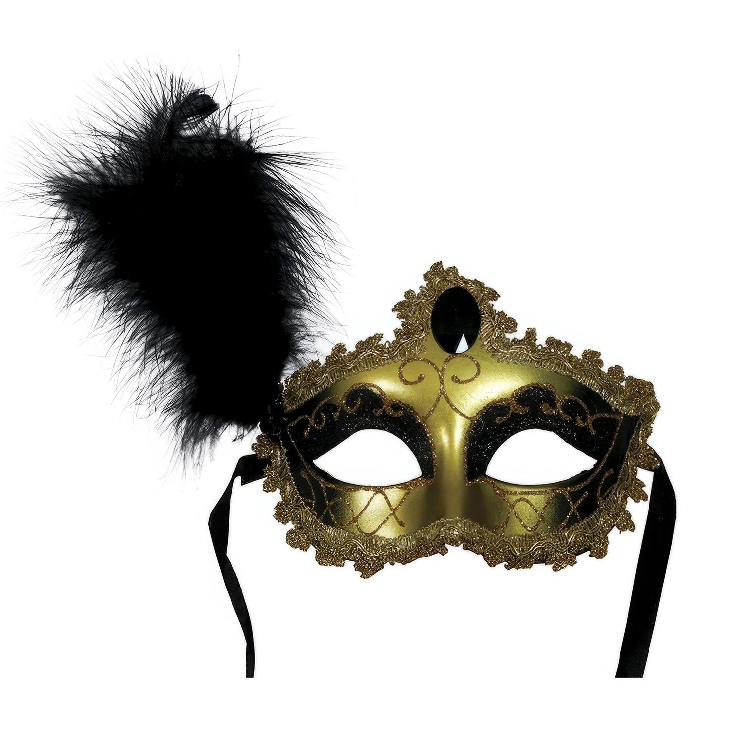 • Елегантна маска за лице в златисто и черно, украсена с ефектни пера за още по-драматичен и стилен вид.