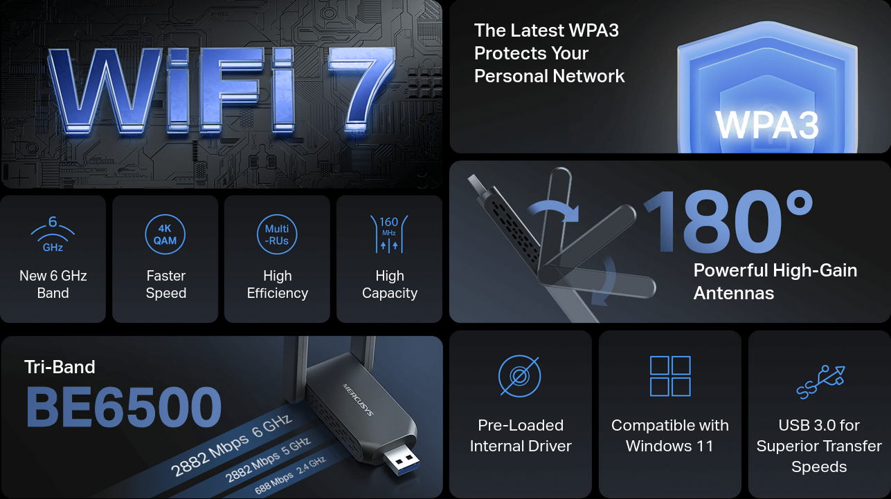 - Backward Compatibility — Full support for 802.11be/ax/ac/a/b/g/n Wi-Fi standards