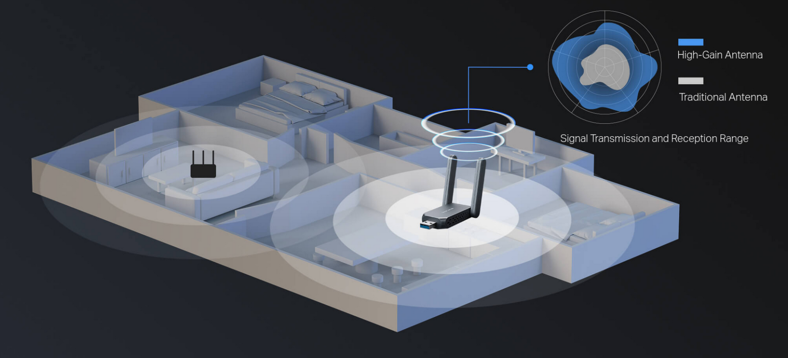 - Wider Signal Coverage – Two high-gain antennas with Beamforming deliver extended range and focused coverage for faster, more stable connections.
