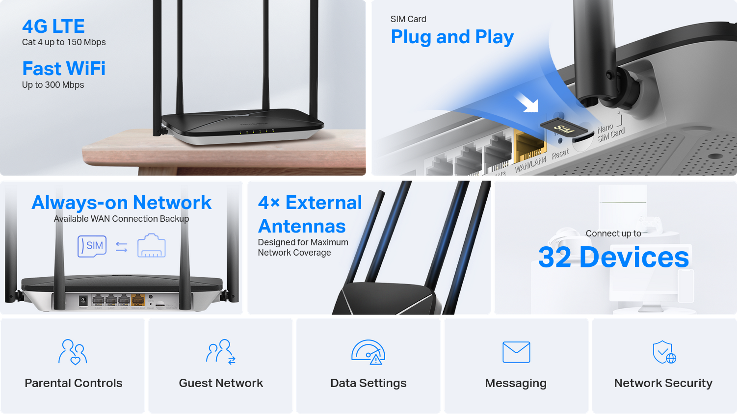 - 4G network – Share internet access with up to 32 Wi-Fi devices and enjoy download speeds of up to 150 Mbps