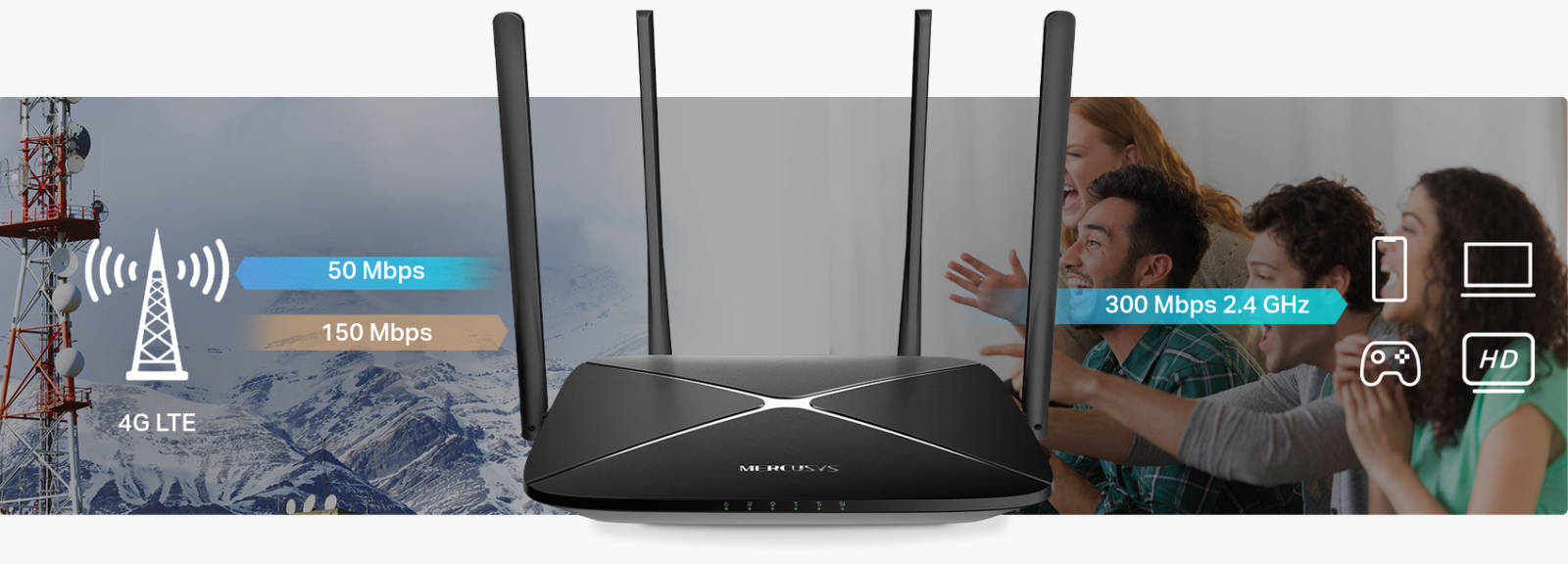 MB115-4G harnesses 4G LTE technology to deliver lightning-fast download speeds of up to 150 Mbps and up to 50 Mbps for uploads. It also shares a WiFi network with a max speed of 300 Mbps on 2.4 GHz—perfect for gaming, streaming, and more.