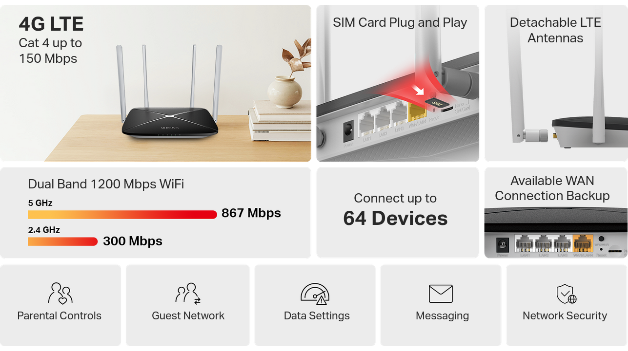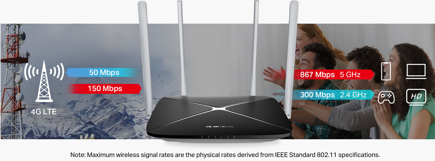 Working as a 4G router, MB135-4G uses 4G LTE technology to achieve speeds up to 150 Mbps download and 50 Mbps upload. It can also share dual-band WiFi network speeds up to 867 Mbps on 5 GHz for bandwidth-intensive tasks like HD streaming and gaming and 300 Mbps on 2.4 GHz for internet surfing, email, and social media.