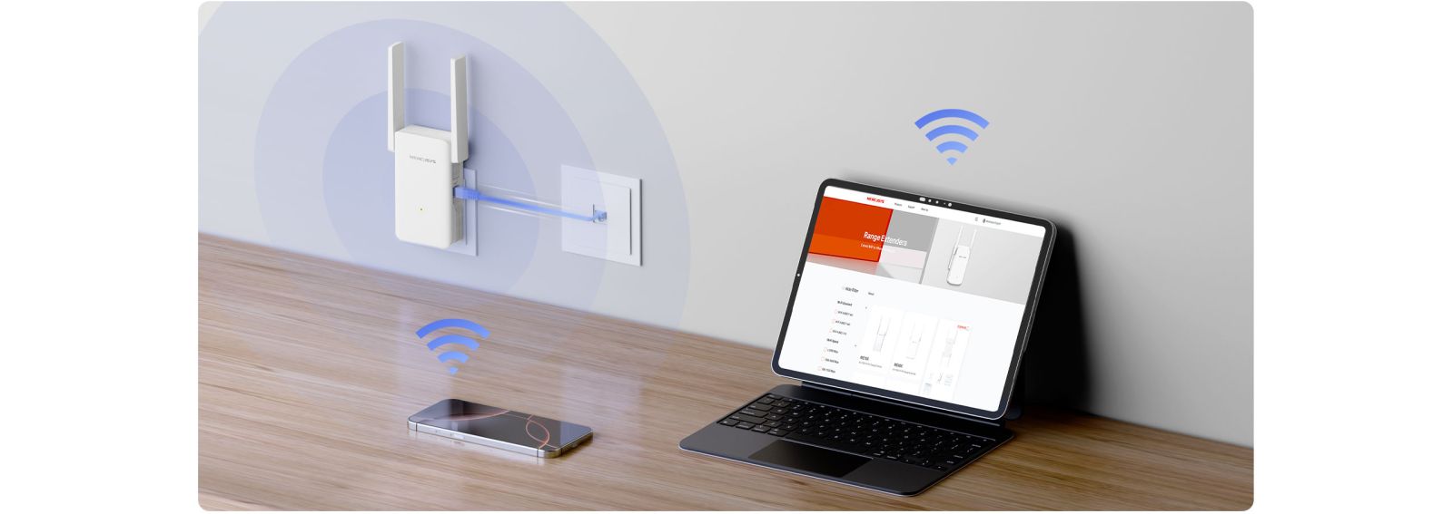 Extend your router’s coverage. This AX3000 range extender, with two adjustable high-gain antennas, boosts WiFi to hard-to-reach areas and is compatible with older WiFi standards (11b/g/n/a/ac) and all connected devices.