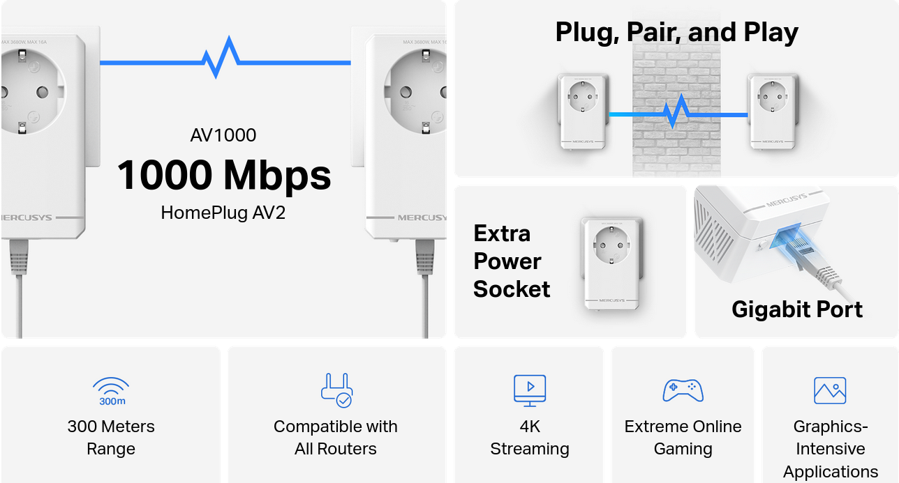 - 1000 Mbps High-Speed Transfer Rate — Fast and stable transmissions with advanced HomePlug AV2‡