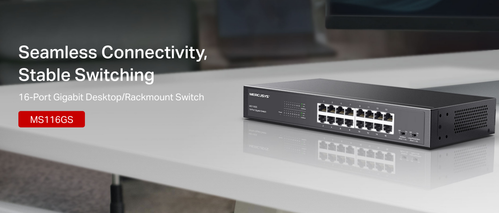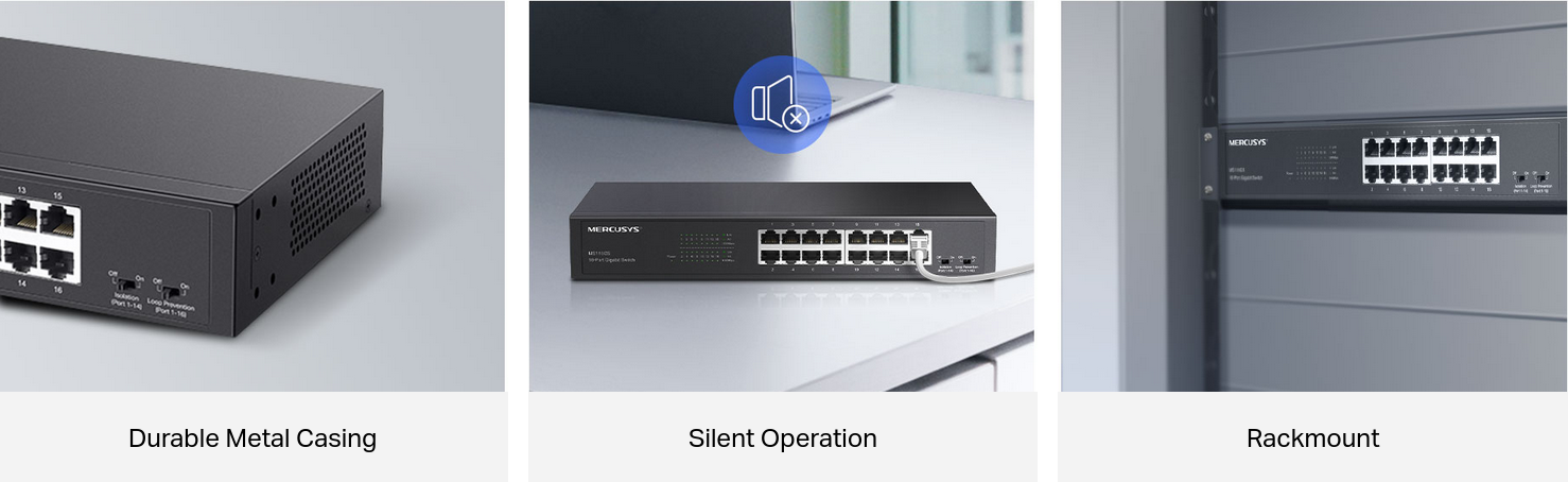 MS116GS’s durable metal case allows for efficient heat dissipation, excellent signal interference prevention, reliable equipment stability, and a long network life. And you can put the switch on desk or rack mount to meet your demand.