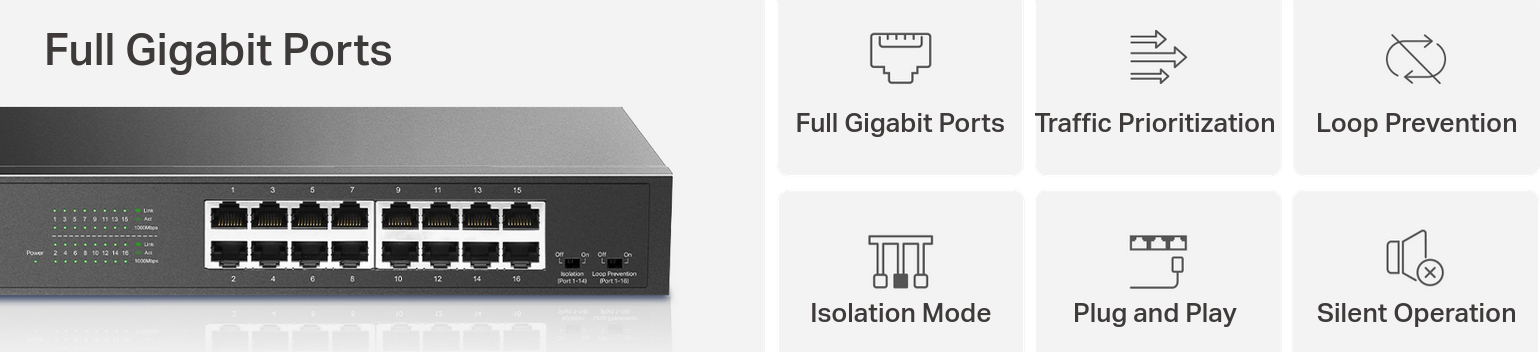 - Full Gigabit Ports: 16× 10/100/1000 Mbps Auto-Negotiation RJ45 port supporting Auto-MDI/MDIX
