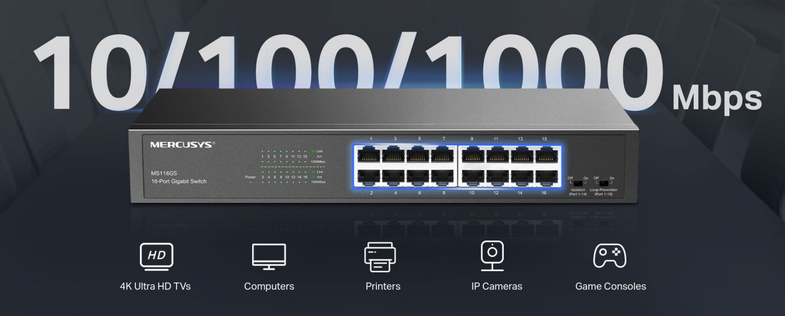 Quickly expand your wired network with sixteen 10/100/1000 Mbps Ethernet ports—10 times faster than regular 10/100 Mbps Ethernet ports. MS116GS offers flexible connectivity and is fully compatible with 4K UHD TVs, computers, printers, IP cameras, game consoles, and more.