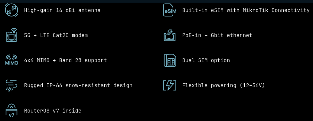 Our first outdoor 5G device with built-in eSIM support, powerful directional antennas, and a cutting-edge Release 16 modem – ideal for rural, urban, and IoT deployments. With Gigabit Ethernet, PoE-in, and instant MikroTik connectivity out of the box, it’s the smart, rugged choice for fast and flexible internet anywhere. IP66 certified.
