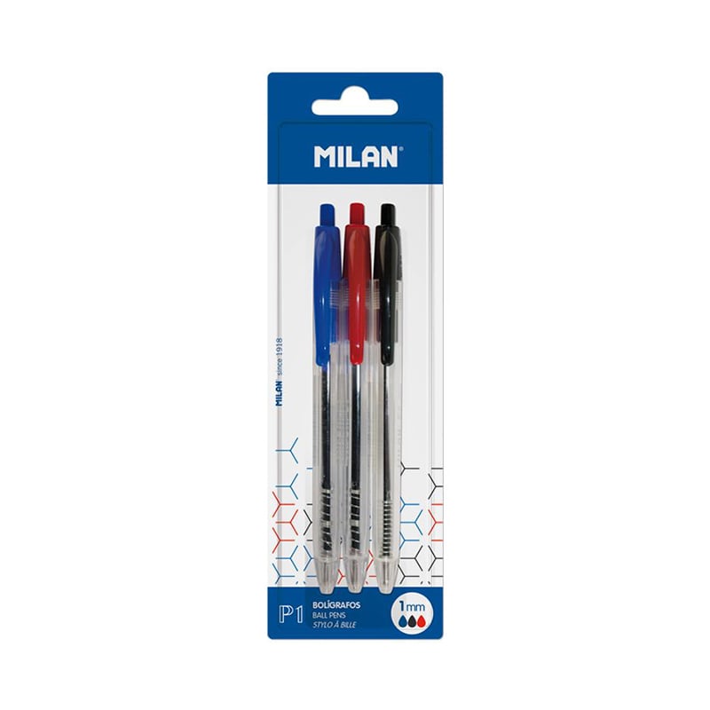 Milan Химикалка P1, автоматична, 3 цвята, 3 броя в блистер