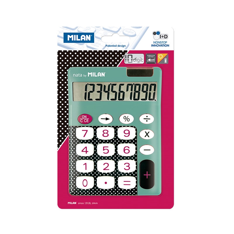 • 10-разряден калкулатор с големи бутони. Притежава атрактивен цветен дизайн в съчетание с бели точки.