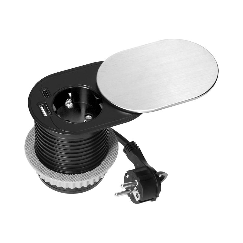 Модул за вграждане в мебел 2P+E Шуко в отвор Ø60mm и 2x USB A+C max 20W с кабел 1.9m H05VV-F3x1mm2 Алуминий. Комбинира естетика, безопасност и практичност. Алуминиево капаче с плъзгащ механизъм – защита от прах и модерен вид. Идеален за бюра, кухненски плотове или конферентни маси, позволява да захранвате до 3 устройства едновременно – без нужда от допълнителни зарядни. USB-A QC 3.0: 5V / 3A, 9V / 2A, 12V / 1.5A ; USB-C PD20W: 5V / 3A, 9V / 2,22A, 12V / 1.67A ; USB A+C: 5V / 3,4A