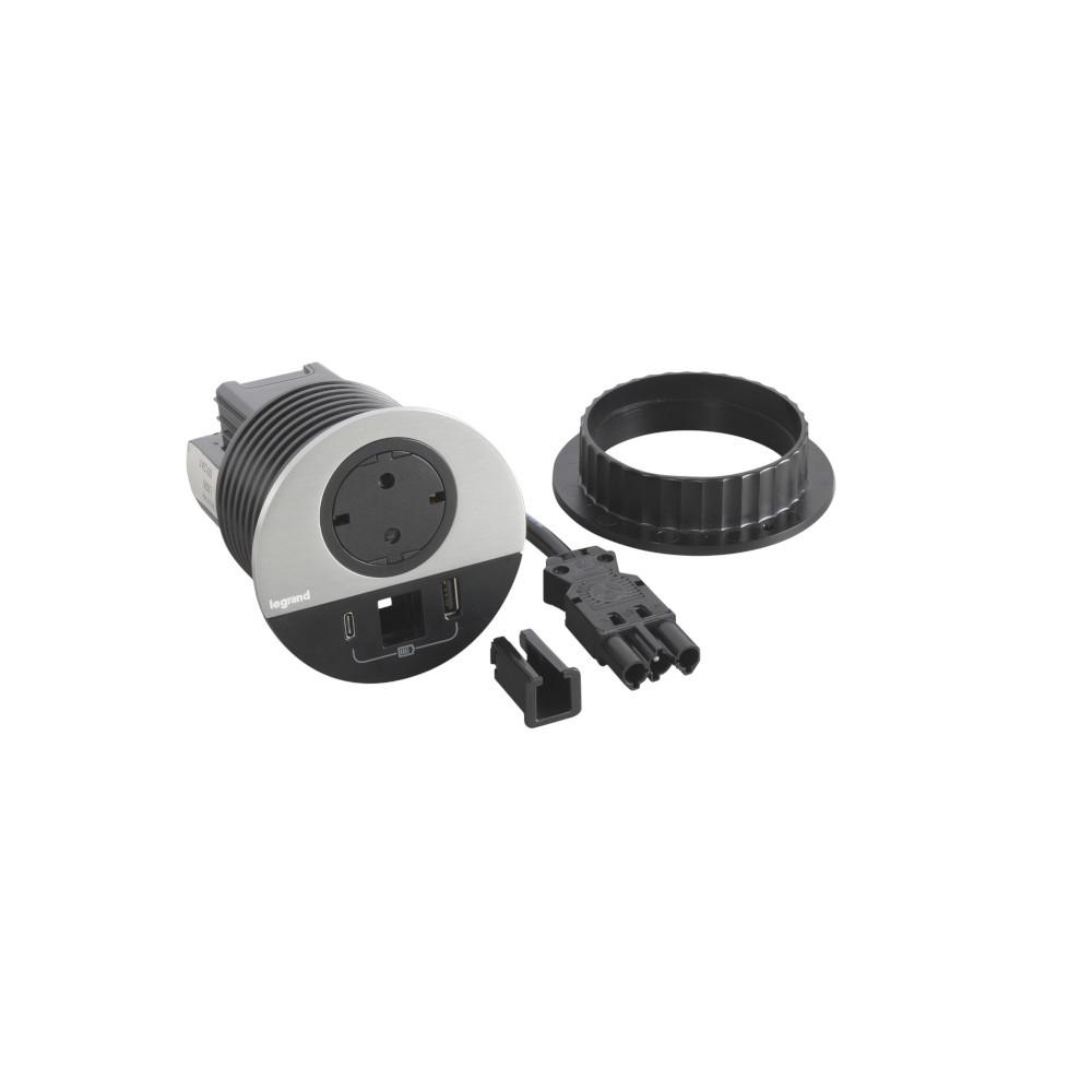 Модул за вграждане в мебел 2P+E Шуко, в отвор Ø80mm, USB розетка 15W тип A+C, с GST18 конектор, цвят Метал Черен - Legrand Incara Disq 80 654716F