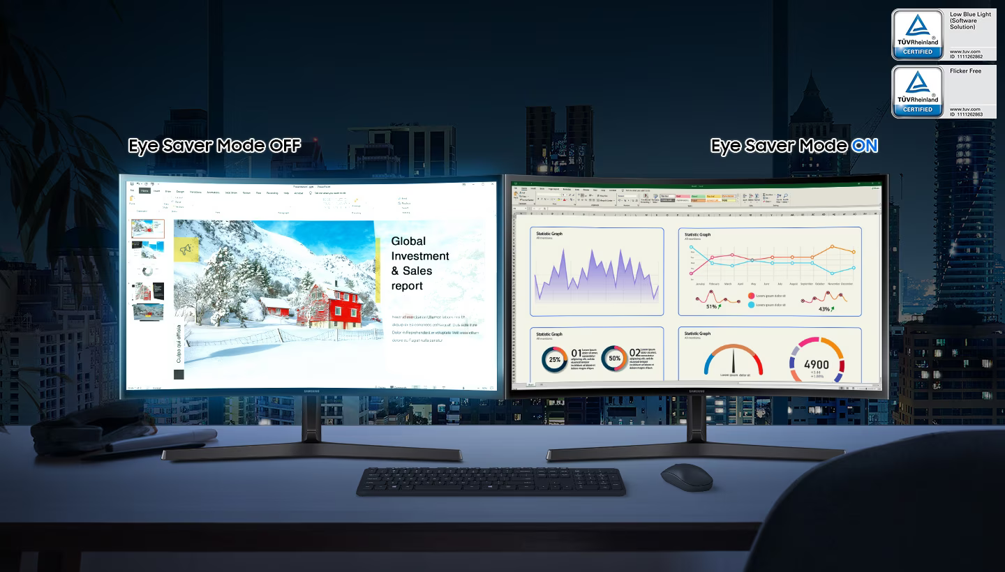 Защитете очите си. Усъвършенстваната технология за осигуряване на комфорт на очите, сертифицирана от TUV, намалява умората на очите чрез минимизиране на синята светлина, като същевременно елиминира дразнещото трептене на екрана.