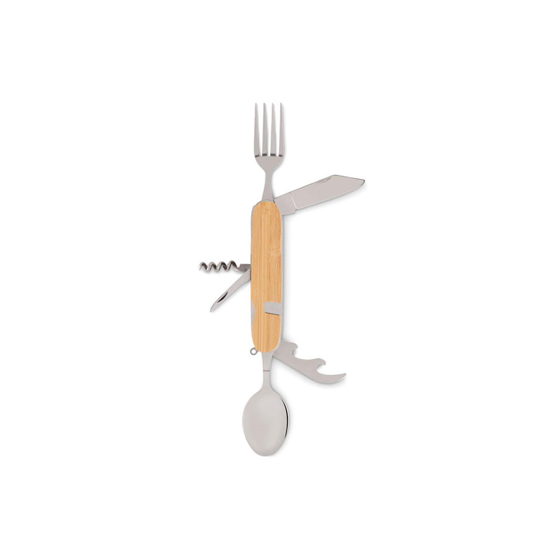 • Включва: вилица, нож, лъжица, отварачка за консерви и отварачка за вино.