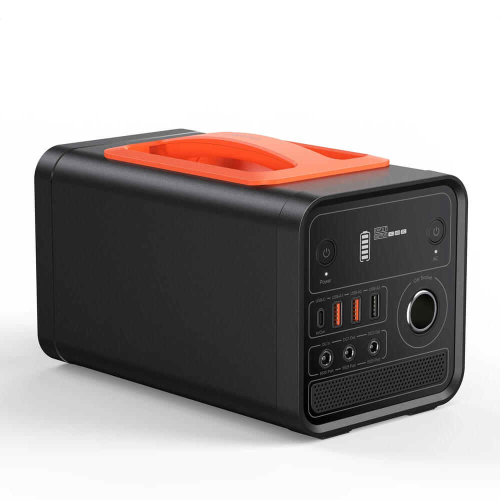 Електростанцията разполага с 5 различни изходни портове - 1 х AC 300W (ел. контакт), три USB-А порта и USB-C порт за бързо зареждане, 2 x 5.5mm 60W DC, както и порт зарядно за кола 120W 12V